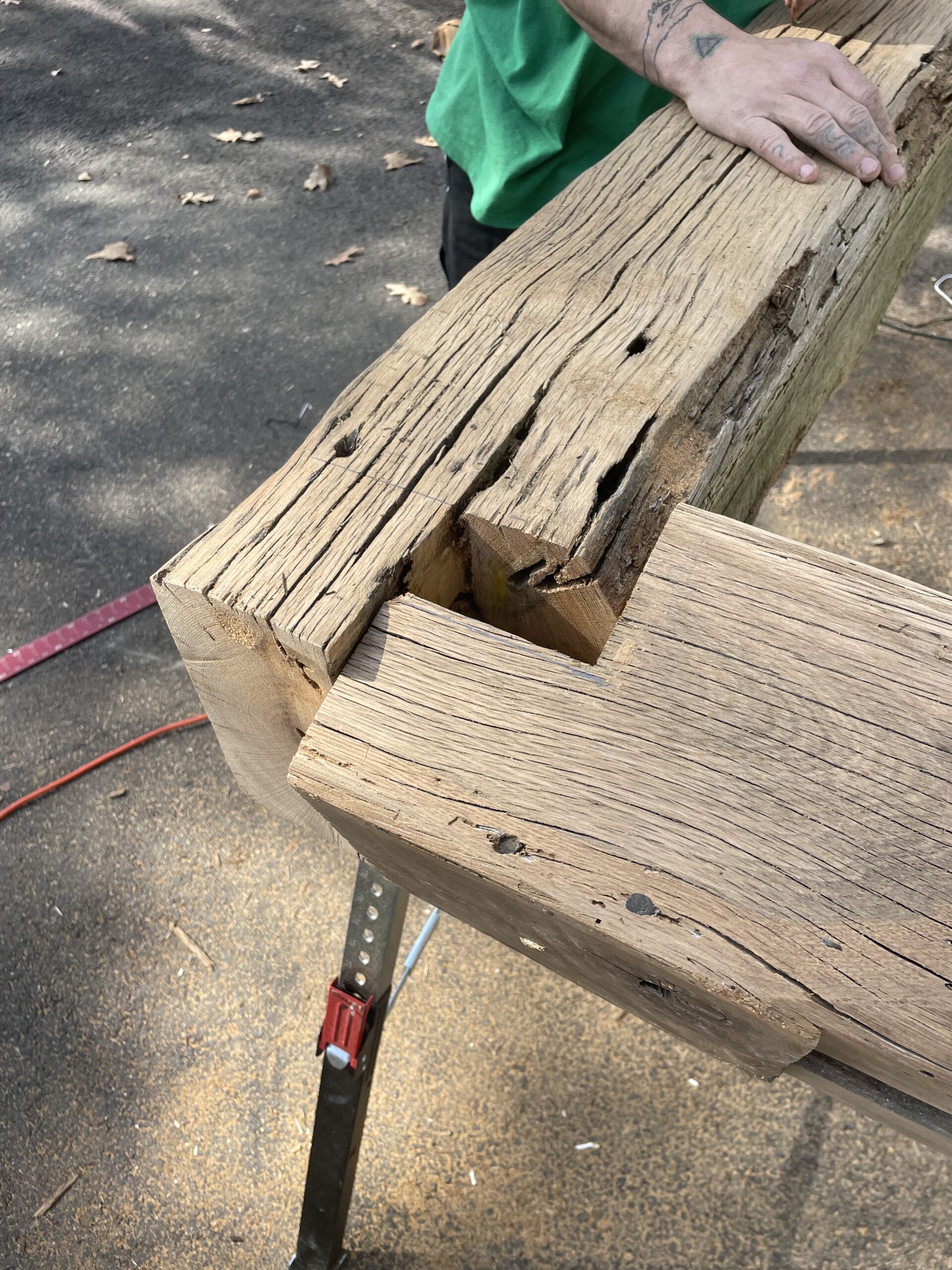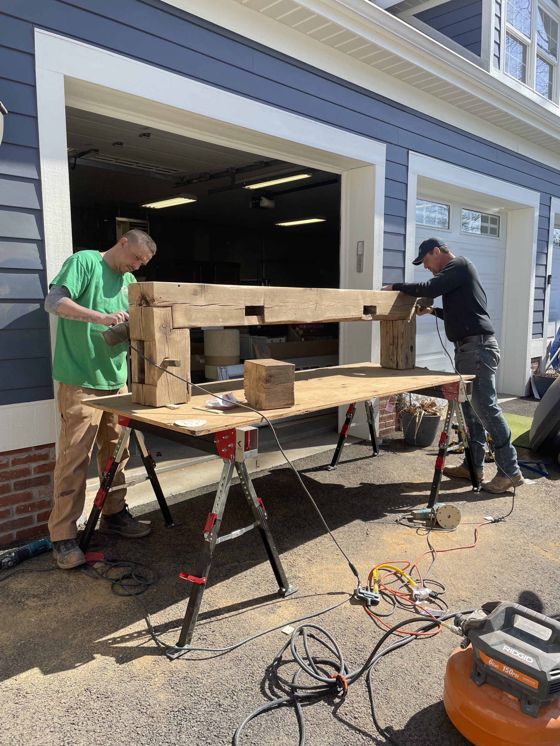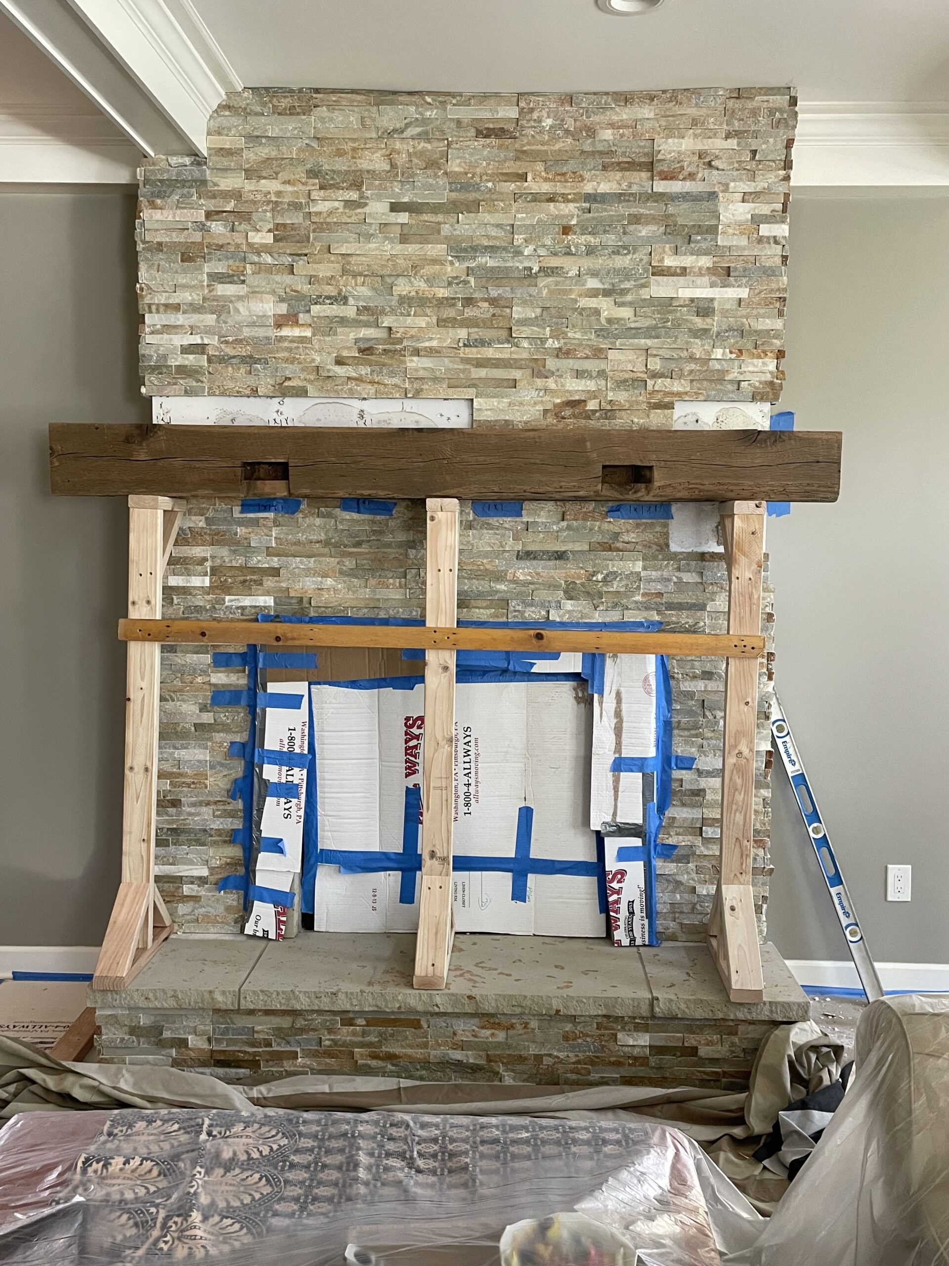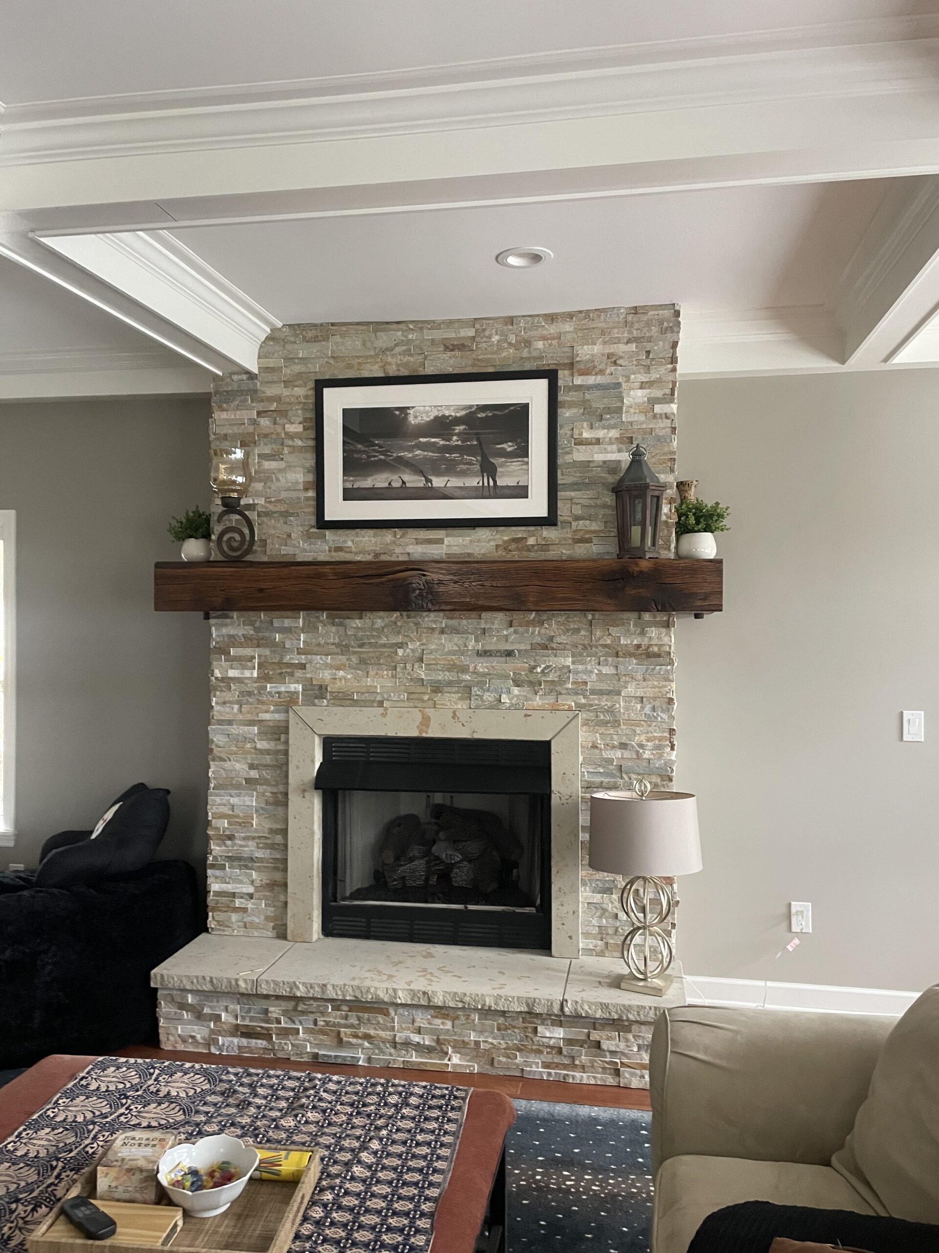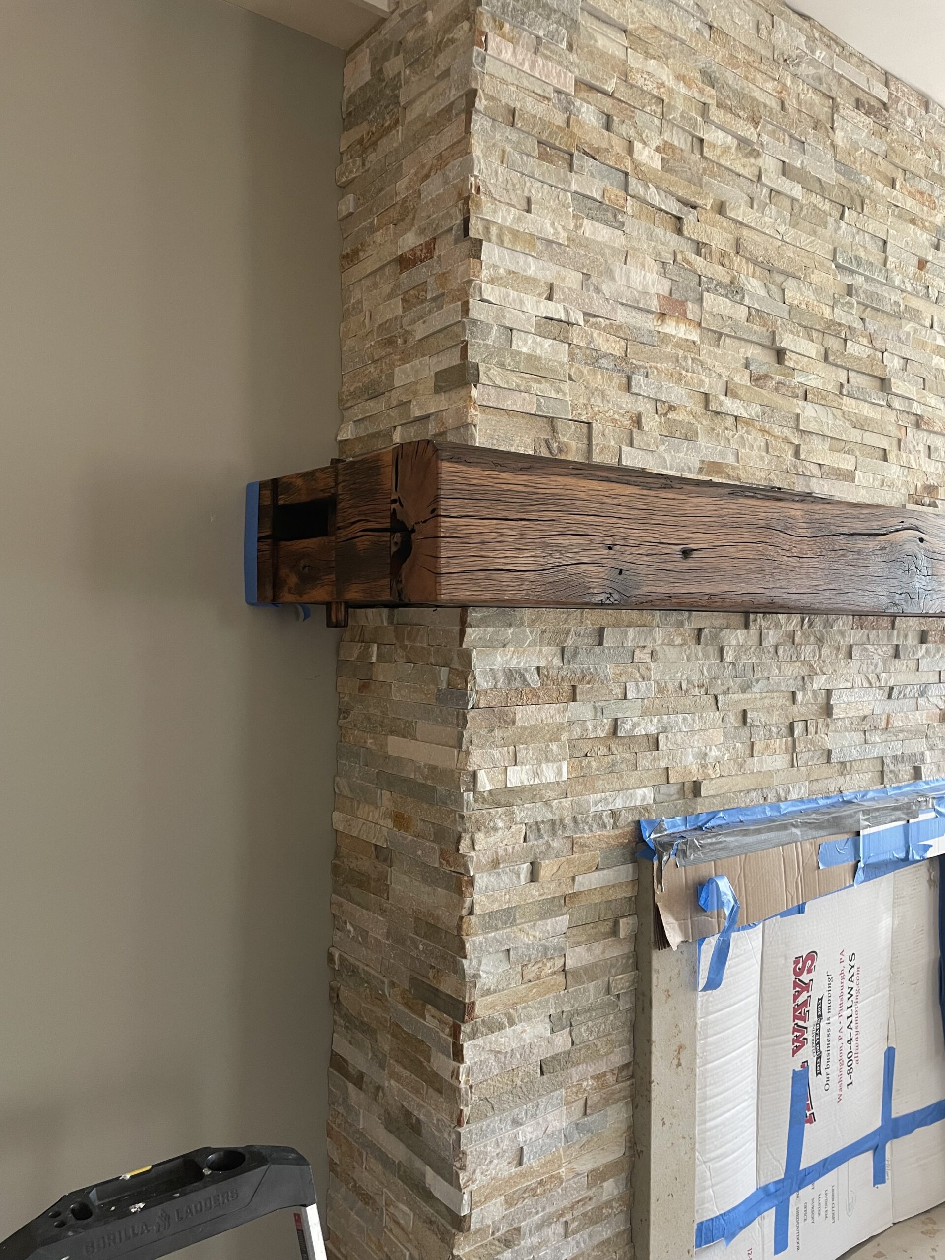 A custom built fireplace mantel using reclaimed 18th century barn beams for customer in Fox Chapel
